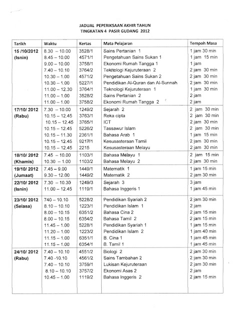 PERUBAHAN TERKINI JADUAL WAKTU PEPERIKSAAN AKHIR TAHUN 2012 TINGKATAN 4